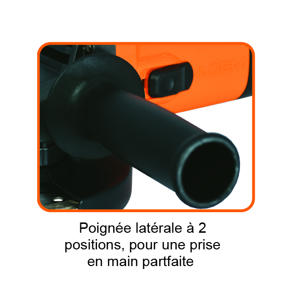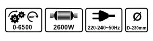 Vue Rapide 340.030TND• The new AG 230 P angle grinder is equipped with an ultra-powerful 2600W motor which provides very high cutting and/or abrasion power. • Thanks to its light weight and ergonomics, this grinder is the most efficient in its category Characteristics: Power: 2600W Disc diameter: 230mm No Load Speed: 6500r/min Spindle Size: M14 Switch Type: Side Spindle Lock: Yes
